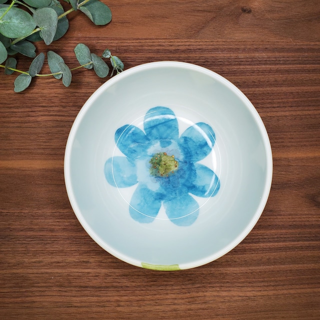 真ん中に大きく描かれた水色の花が美しく魅力的で、使う人を幸せな気持ちにさせてくれます。 大きすぎず小さすぎず、深さがありますので普段の食卓での出番も多く、サラダだけでなく副菜やヨーグルトなどにもおすすめです。 色味も上品ですので、おもてなしの小鉢としても活躍してくれます。 金彩が施されていますので電子レンジは出来ません。 一つ一つ手作りの為、色や形等、若干異なります。ご了承ください。 径12.4㎝、高さ5㎝ 食洗機 〇 電子レンジ ✕ オーブン ✕